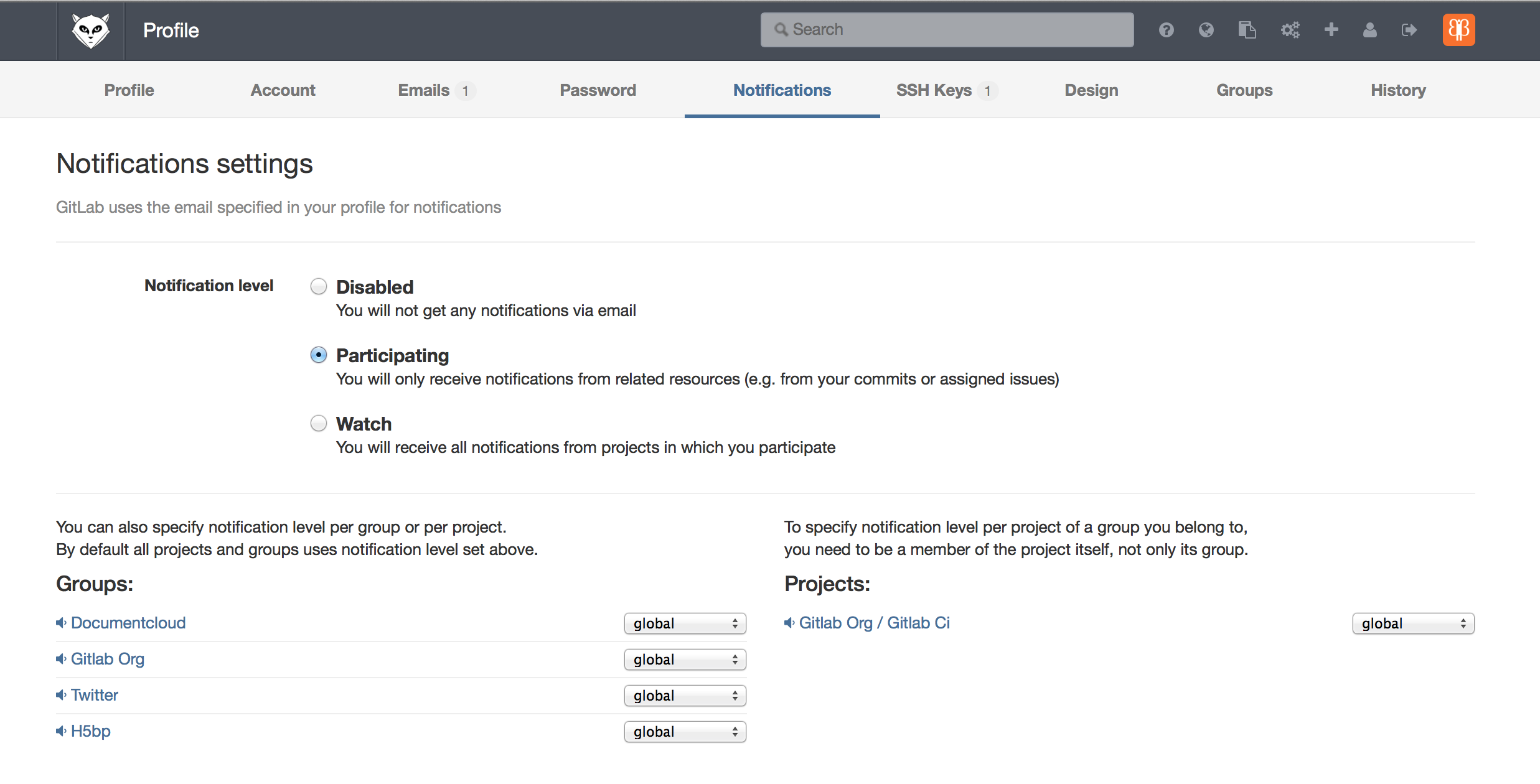 Group Settings are taking precedence over Global Settings but are on a level below Project Settings. This means that you can set a different level of notifications per group while still being able to have a finer level setting per project. Organization like this is suitable for users that belong to different groups but don't have the same need for being notified for every group they are member of.